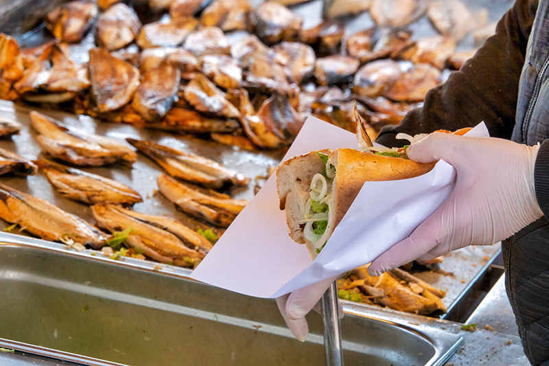 One of Istanbul’s signature street foods is balik ekmek (‘fish bread’) enjoyed by the Bosphorus coast. There’s nothing fancy about this sandwich, just a fillet of grilled fresh-caught fish (typically mackerel) tucked into plain white baguette bread and topped with onions, lettuce and a squeeze of lemon juice. A condiment of spicy pickled peppers or a drink of fermented purple carrot juice (şalgam) adds a bit more flavor.