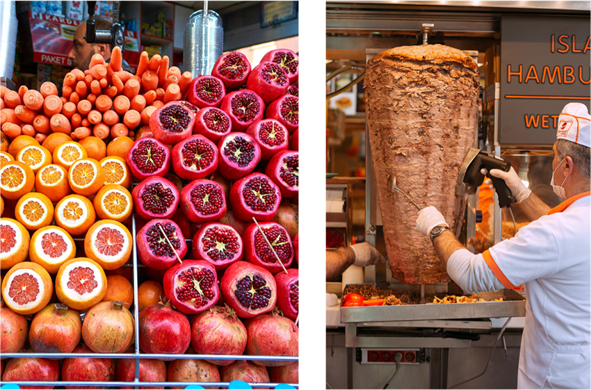 Pass by the Galata Mevlevi Lodge (which holds whirling dervish performances) and along a street filled with musical instrument shops and independent boutiques selling Turkish towels, olive oil soaps and unique clothing. Take a moment to refresh yourself with a fresh-squeezed juice at a “vitamin” stand. You can easily spot them by their vivid displays of oranges, pomegranates, apples, etc. And why not also try döner kebab alongside a surprising salted yogurt drink called ayran?