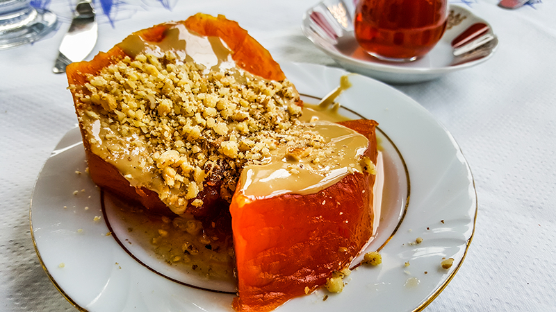 There is no end to the list of pumpkin dishes we can enjoy when autumn arrives. In Turkey, the pumpkins may look a bit unrecognizable on the outside, but the inside offers the same golden-orange goodness. Kabak tatlısı, translated as pumpkin dessert, is a traditional Turkish dish you can find in all regions of Turkey. The candied gourd is a light and very sweet way to end a meal. Try it for your next fall or winter holiday gathering and we guarantee your guests will be impressed!