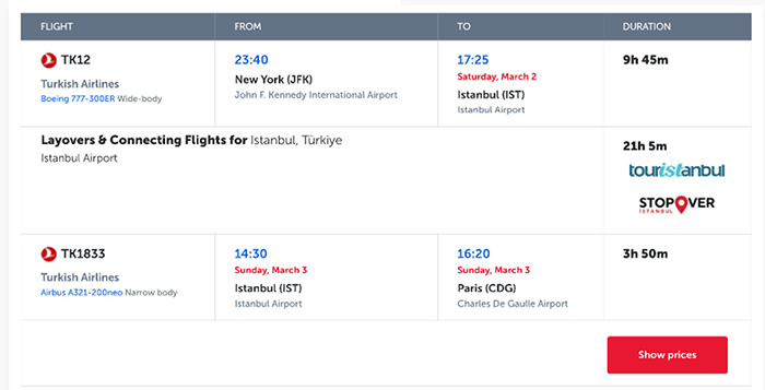 This roundtrip flight from New York City to Paris has a 21-hour stopover in Istanbul.